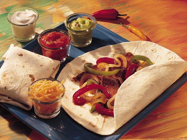 Cut beef across grain into very thin slices. For each fajita, place a few slices of beef, peppers and onion mixture, cheese, picante, guacamole, sour cream on center of tortilla. Wrap and enjoy!