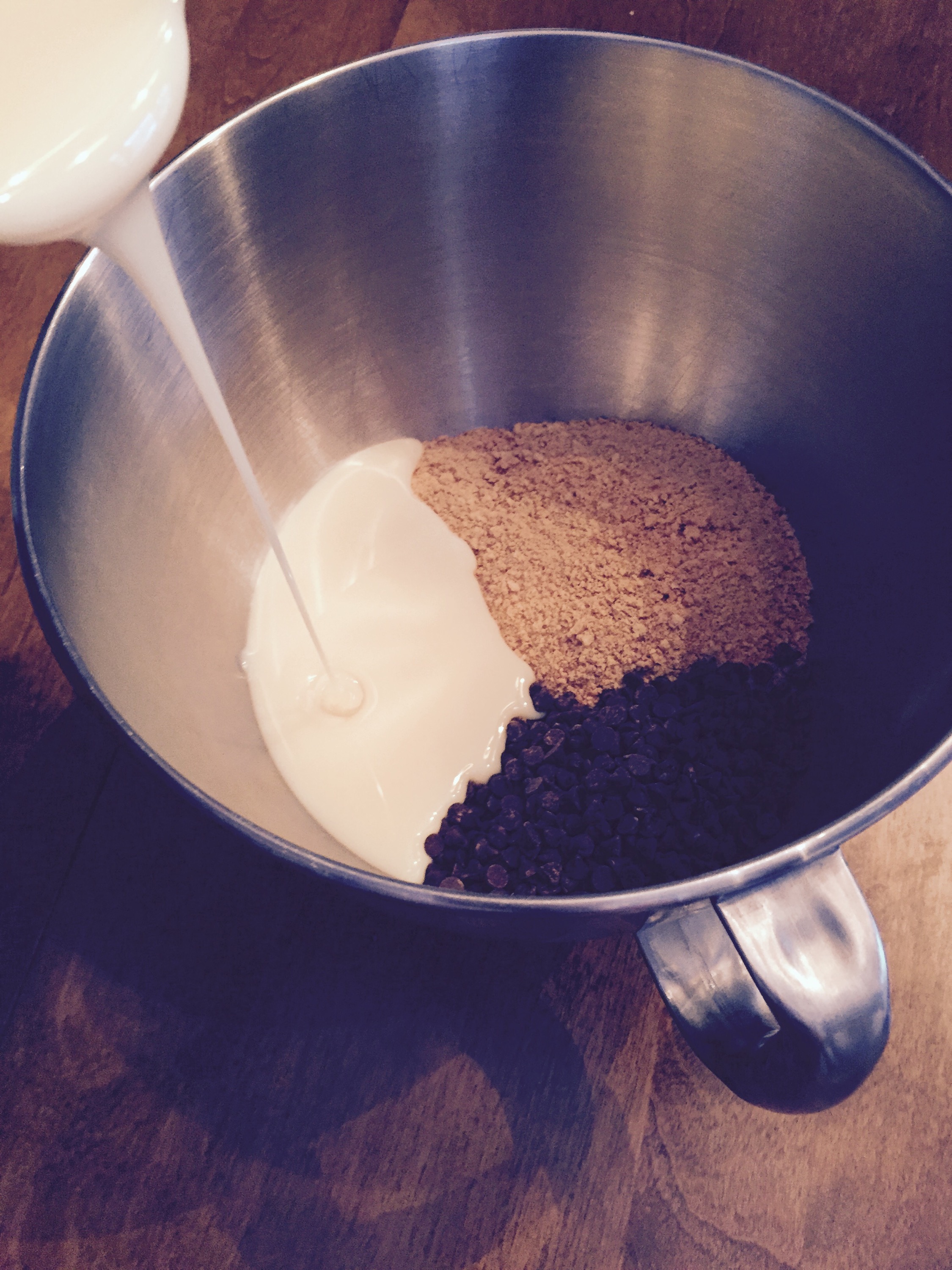 Mix together graham crackers, chocolate chips and sweetened condensed milk.