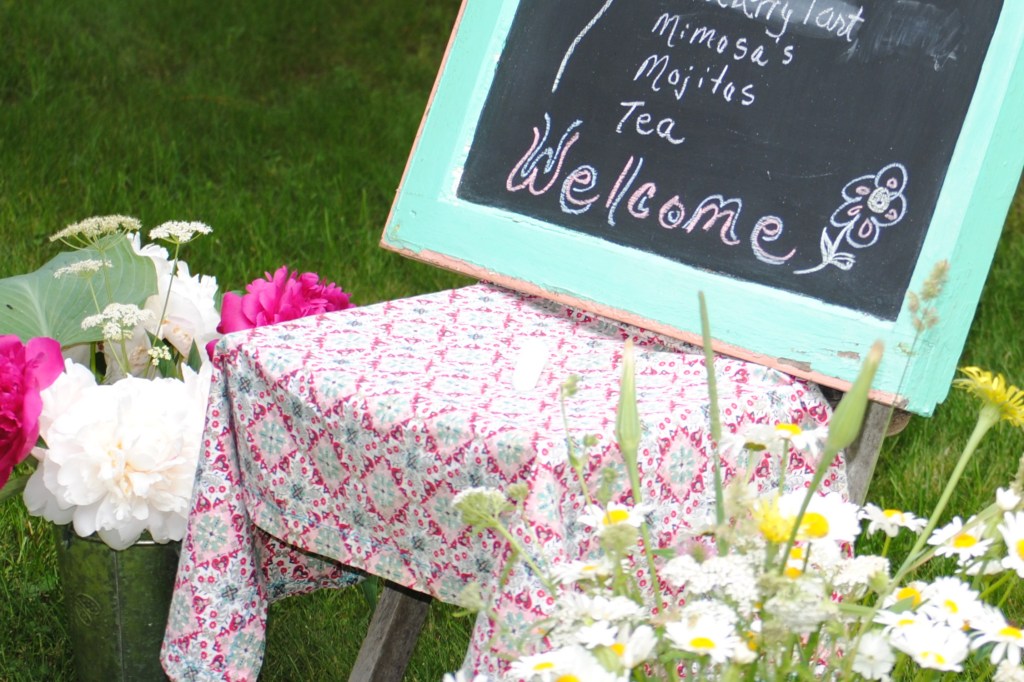 I love the detail – the cute sign, the print on the fabric, and the flanking of peonies and daisies.