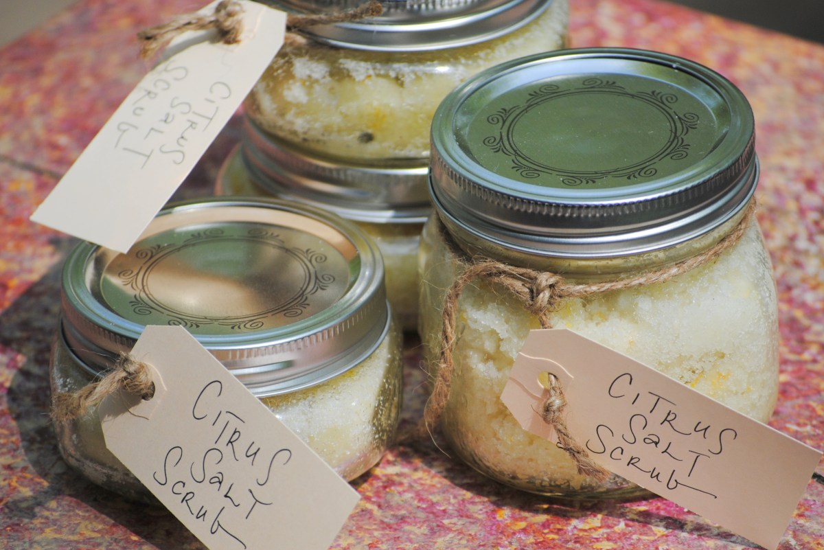 So, when I stumbled upon this Citrus Salt Scrub, I was anxious to give it a try. I assembled these for the important mom’s in my life for Mother’s Day this year. This scrub would also make a great hostess gift or sweet (or more appropriately salty) addition birthday or shower gift. (Think pampering.)